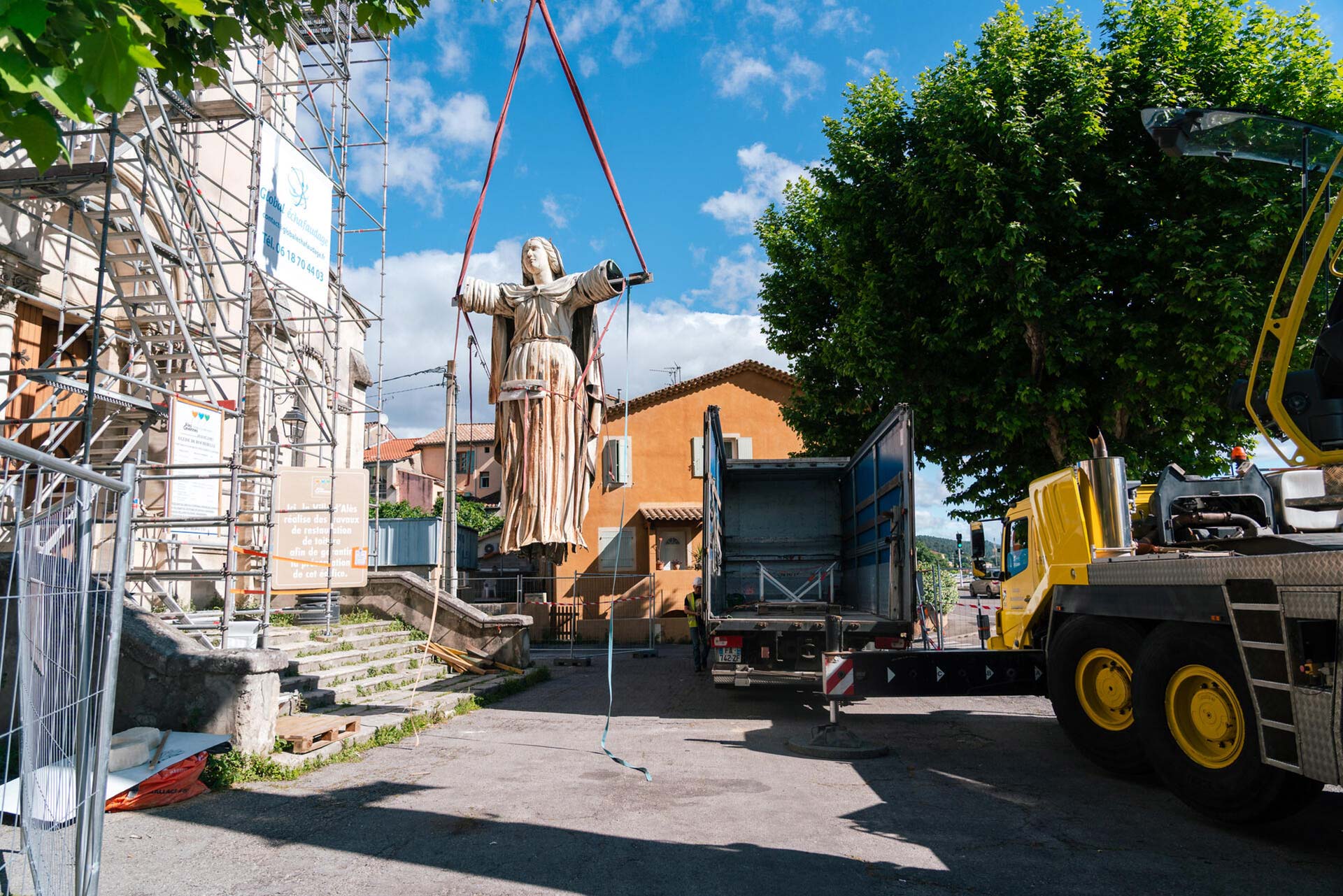 Nombreux étaient les curieux à s’arrêter pour assister à cette opération pour le moins inhabituelle. Ce jeudi 22 mai, à l’église de Rochebelle, la statue de la Vierge a été démontée et descendue du clocher. Datant de 1861, mesurant environ 4 m et pesant près de 400 kg, cette sculpture en cuivre va être transportée dans un atelier de restauration en Dordogne pour retrouver son éclat.