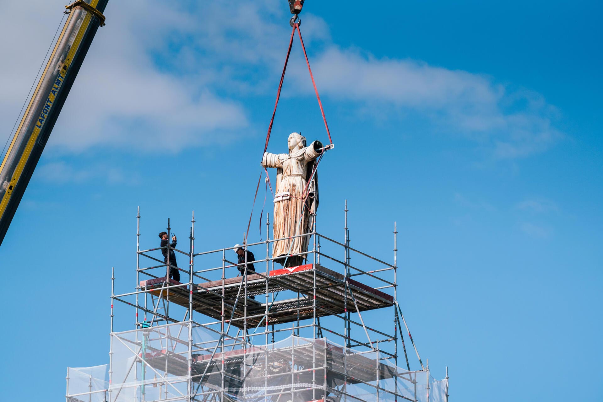 Malgré quelques bourrasques, la statue a pu être installée sur un socle dédié à son transport sans aucun accroc.